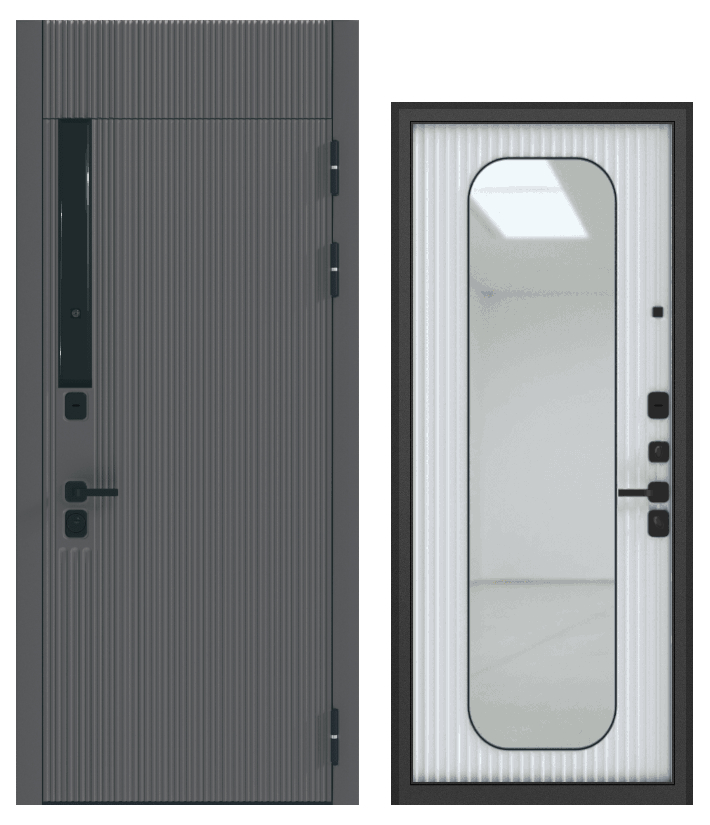 Дверь металл ГТ-58 ( МДФ веллюто кофе / МДФ веллюто бьянко + зерк.вставка ) (2050*860, правая, черный муар, черн.фурн)