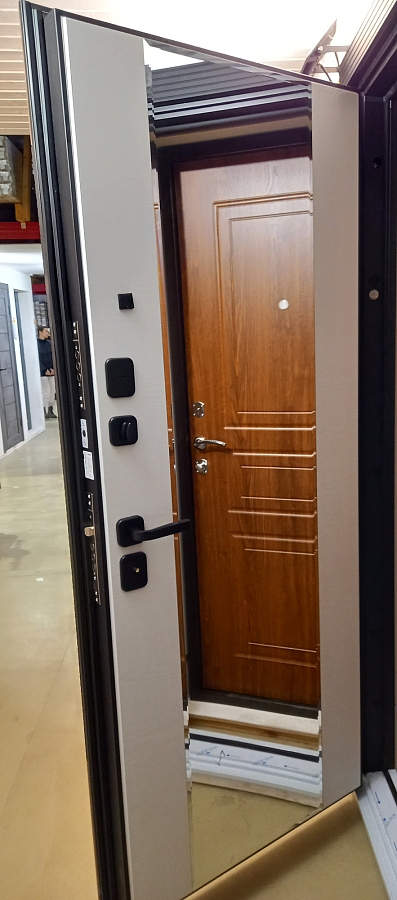 Дверь мет. БЕРИЛЛ КВАДРО-3 (Софт черный+Орех каньон коньяк, Дуб кантри горизонт) (2050*960, правая, Зеркало без гравировки , фацет по периметру , черный муар, черн.фурн)