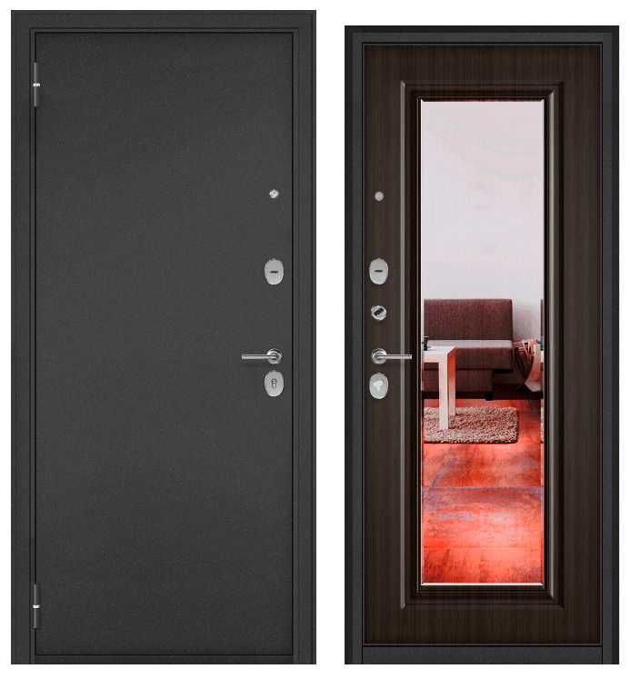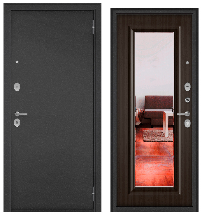 Бульдорс ФЭМЕЛИ ЭКО, МДФ ларче шоколад E-140 зеркало, 2 замка (2050*860, правая, Ночная задвижка, букле антрацит, хром)