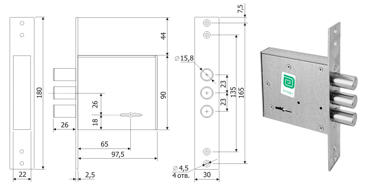 Два полуоборота, вылет ригелей - 26 мм. Баксэт - 65 мм